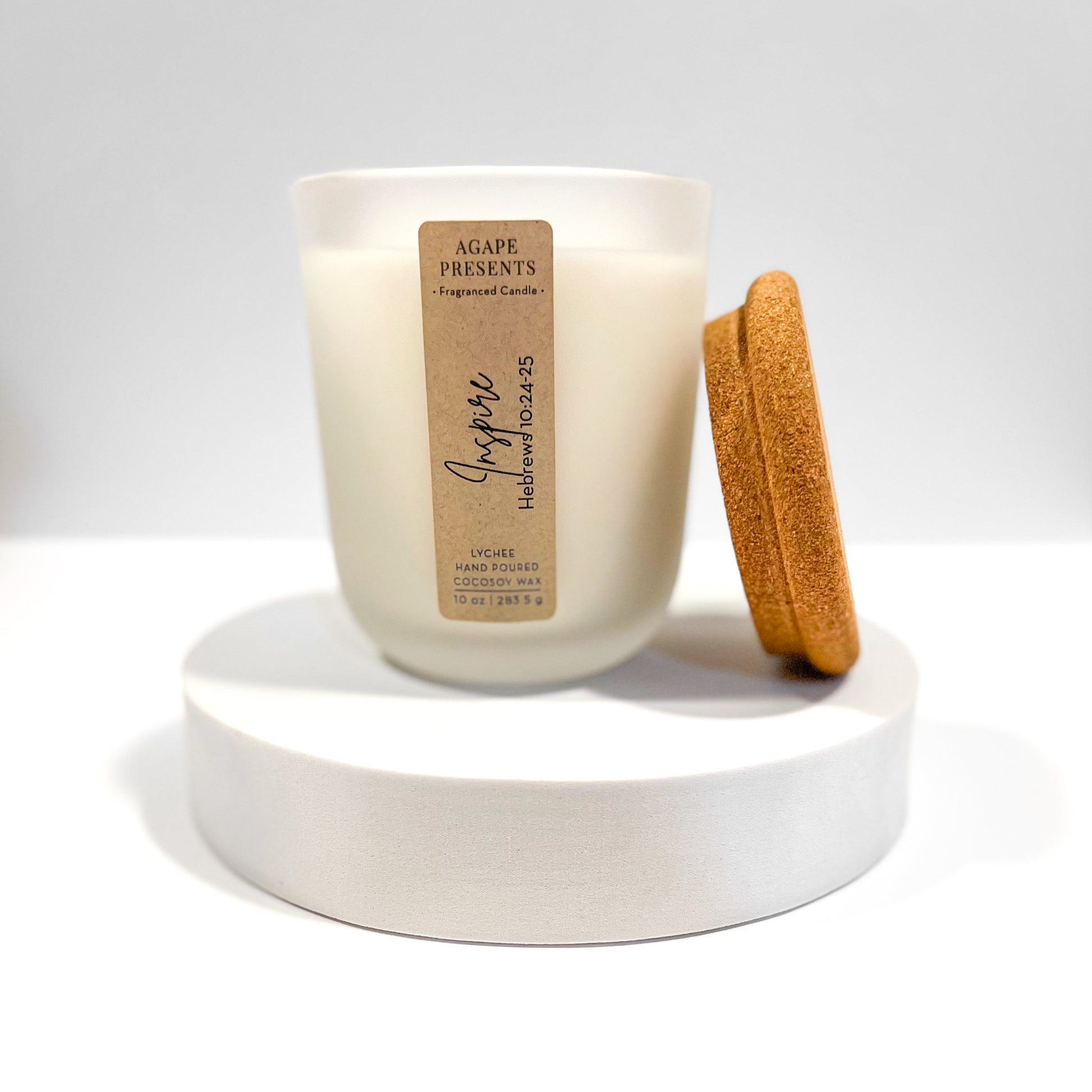 Candle vessels are completely sustainable, made from eco-friendly frosted glass, paired with natural, renewable, and recyclable cork lids.