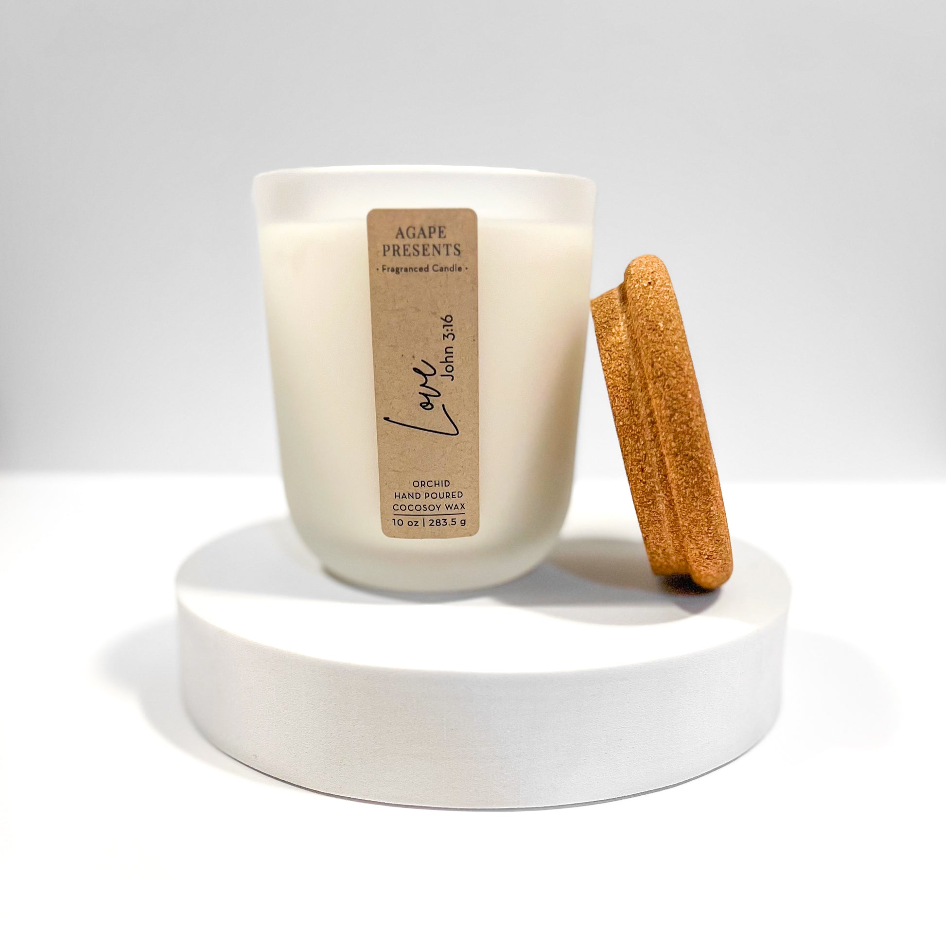 Candle vessels are completely sustainable, made from eco-friendly frosted glass, paired with natural, renewable, and recyclable cork lids.